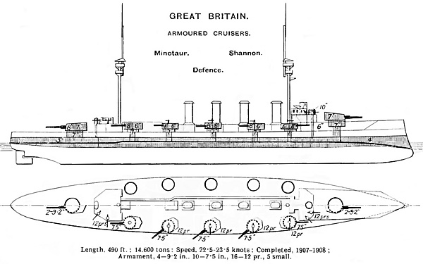 | HMS Minotaur (1906) | Devonport Dockyard | Hawthorn | 2 Января 1905 | 6 Июня 1906 | 1 Апреля 1908 | £1 438 065 * |