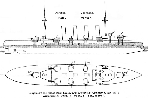 «Уорриор» — заложен 5 ноября 1903, спущен 25 ноября 1905, вступил в строй 12 декабря 1906 года. включён в состав 5-й крейсерской эскадры Флота Метрополии. После реорганизации переведён во 2-ю крейсерскую эскадру, где находился до 1914 года. В 1914 году переведён на Средиземное море, затем зачислен в состав 1-й крейсерской эскадры Гранд-Флита. Участвовал в Ютландском сражении, затонул от повреждений, полученных от огня противника 31 мая 1916 года.