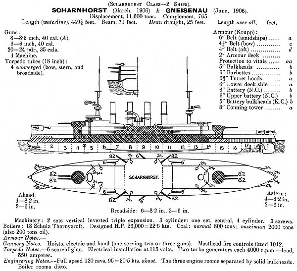 «Гнейзенау» — Заложен в декабре 1904, спущен 14 июня 1906, вошёл в строй 6 марта 1908.