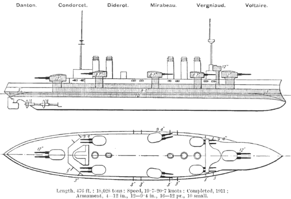 Всего в 1906—1911 годах было построено шесть кораблей типа «Дантон». Выбор французского флота в пользу строительства ещё одной серии броненосцев объяснялся экономией средств и меньшей на тот момент рискованностью подобного решения, однако успех линкоров дредноутного типа и переход других стран к их строительству сделал броненосцы типа «Дантон» устаревшими ещё до вступления в строй. Корабли этой серии являлись одними из мощнейших эскадренных броненосцев в мире, по мощности артиллерийского вооружения сравнимыми с ранними дредноутами, хотя проблематичность контроля стрельбы смешанной артиллерии крупного калибра в значительной мере сводила на нет это достоинство.