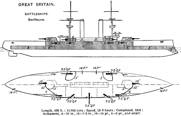 Броненосцы типа «Свифтшур» были сравнительно легко вооружены и имели небольшие по британским стандартам размеры, были бронированы аналогично броненосцам типа «Дункан», однако имели бо́льшую скорость и сравнительно мощную артиллерию среднего калибра, но главный калибр был всего лишь 254 мм, поэтому были приняты на вооружение как броненосцы II ранга; последними кораблями британского флота, отнесёнными ранее к этому классу, были броненосцы типа «Центурион» и «Ринаун», вступившие в строй десятью годами ранее.