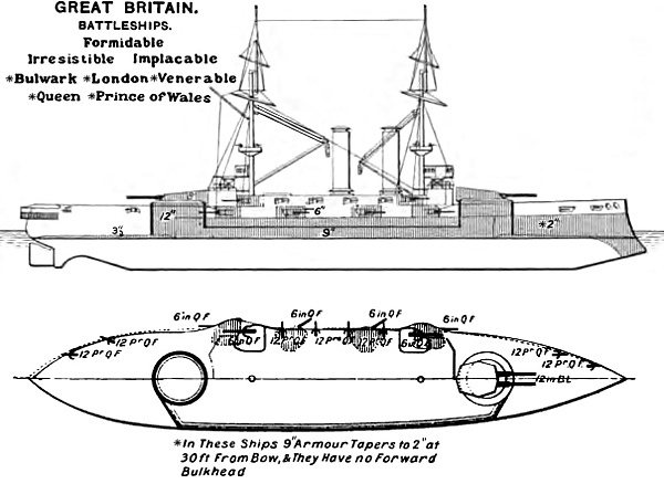 Уайт разработал проект улучшенной «Сикисимы», который и стал известен как «Формидэбл». У. Уайт разработал 2 варианта. По каждому из них новый броненосец имел на вооружении 4 12-дм орудия, толщину броневого пояса 8 дм (203 мм) и проектную скорость хода 18 узлов. В первом варианте броненосец должен иметь вспомогательный калибр из 12 152 мм орудий, а водоизмещение около 14 700 тонн, на 200 тонн меньше, чем у «маджестиков». По второму варианту число 152 мм орудий 14, как на японских броненосцах, а водоизмещение составляло 14 900 тонн, на 100 тонн меньше, чем у «Сикисимы».