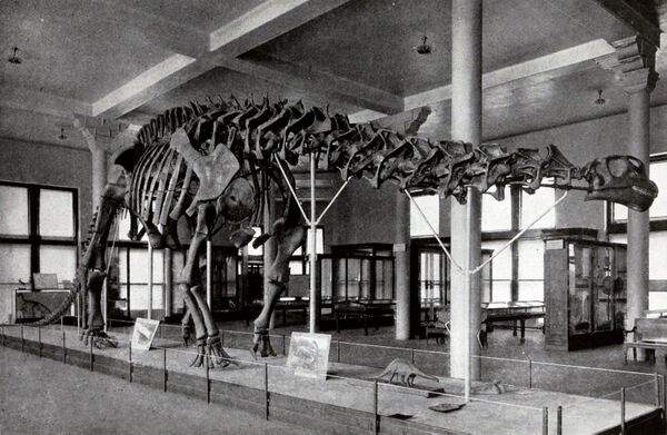 В 1905 году Американский музей естественной истории обнародовал первый в истории скелет зауропода, который они назвали видом Brontosaurus excelsus. Образец был достаточно полным, отсутствовали только передние конечности (были добавлены от образца AMNH 592), задняя конечность и плечевые кости (были добавлены от образца AMNH 222) и хвостовые кости (были добавлены от образца AMNH 339)[5]. Чтобы завершить реконструкцию, остальная часть хвоста было сформирована по представлениям Марша, о том какой она могла быть, и получилась с слишком малым числом позвонков. В реконструкцию, так же, была добавлена скульптура того, как предполагалось выглядел череп этого массивного животного. Это был не тонкий череп как у диплодока, который позже оказался бы более точным, а массивный, основанный на самых толстых костях черепа, нижней челюсти и зубах из трех разных карьеров. Череп был вручную вылеплен Адомом Германом. Генри Фейрфилд Осборн отметил в публикации, что череп «в значительной степени предположителен и основан на черепе морозавра» (теперь Camarasaurus)[6].