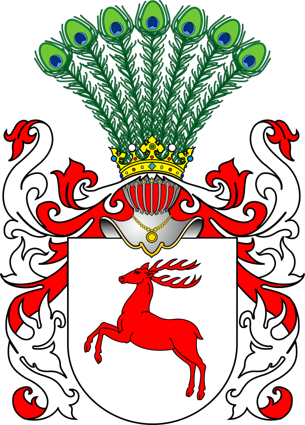 Эта эмблема в древности перенесена из Германии и в некоторых гербах подвергается следующим видоизменениям: олень бывает обращён вправо и без короны на шее, или изображается одна его передняя половина, выходящая в золотом поле из полумесяца, обращённого рогами к нижнему левому углу. Луна золотая, под нею золотая же звезда. На павлиньем нашлемнике видна золотая луна рогами вниз, под нею такая же звезда[1].