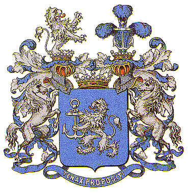 Щит увенчан дворянскими шлемом и короной на коей таковой же якорь. Намёт на щите голубой, подложенный серебром. Под щитом на голубой ленте надпись «TENAX PROPOSITI».