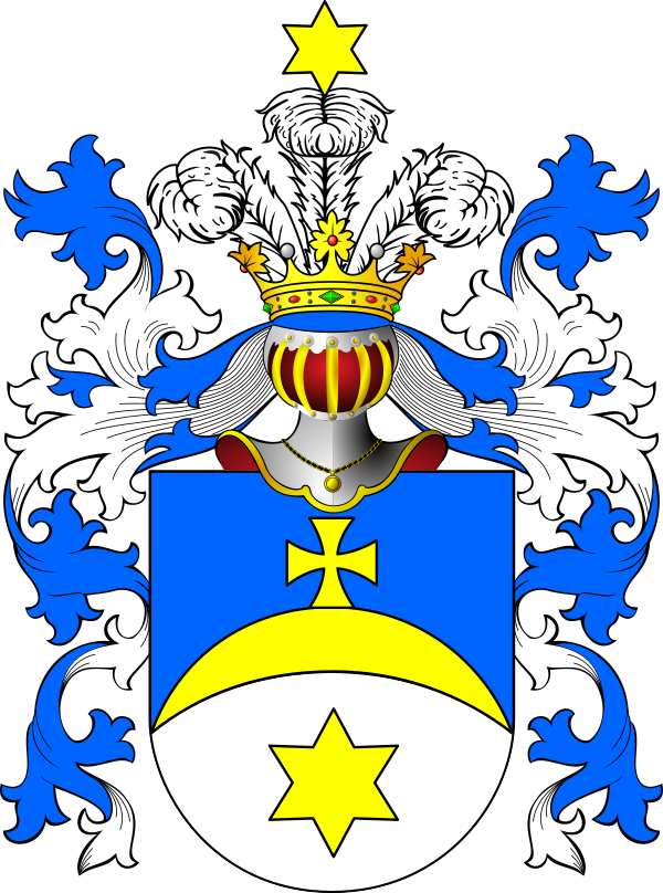 Щит, золотым полумесяцем, рогами вниз обращенным, разделен пополам; на полумесяце в верхнем голубом поле, золотой кавалерский крест, а под полумесяцем в серебряном поле золотая звезда.