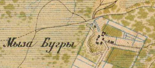 На подобной карте 1855 года нанесена мыза Бугры купца Загамели; обозначены усадебные постройки: рига, сарай, колодезь. Обозначена она и на картах 1860 года[3] и 1885 годов[4].