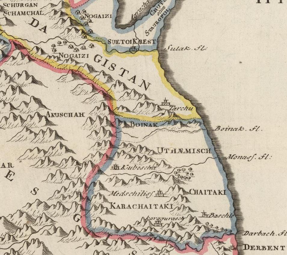 «Бойнак от моря… верстах в 5-ти, поселены в полугоре и вокруг его буераки. Жило в нём дворов с 30 и строение бездельное, …с поля защиты никакой нет, только есть повыше сего строения, где Муртузалей (правитель Буйнака — М.-П.А.) сам живёт, зделан маленькой городок…».