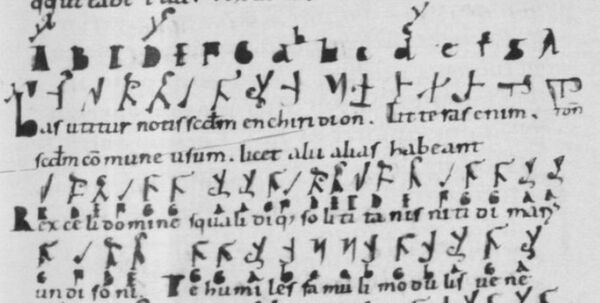 Латинская буквенная неоктавная нотация (использовались буквы алфавита от A до P) впервые регистрируется в учебных трактатах эпохи Каролингского Возрождения, например, в анонимном трактате IX в. «Alia musica». Изредка она также встречается в нотных рукописях, например, в тонарии французского происхождения, начала XI века (кодекс Montpellier H159, см. иллюстрацию).