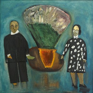 В центре композиции изображён букет в вазе, установленный на круглом столе круглой формы. Слева от стола находится фигура мужчины в чёрном костюме, а справа — женская фигура в чёрном платье в белый горошек. Сцена выполнена в традициях бытового жанра, акцентируя внимание на деталях повседневной жизни и предметном окружении.