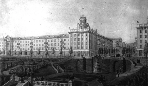 Бульвар Гагарина, 25. Угловое здание Дома профсоюзов (архитекторы Н. В. Куспак и А. М. Гуров, 1952).[1]:66