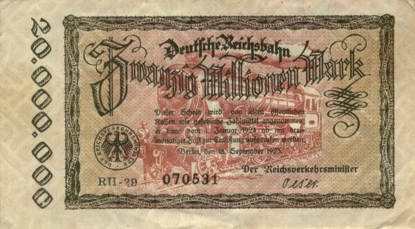 Во втором полугодии 1923-го денежная масса бумажных марок стала стремительно расти и увеличилась в 130 тысяч раз, инфляция превратилась из «ползучей» в гиперинфляцию. Государственные типографии не успевали печатать деньги, приходилось привлекать частников. Иногда нули на банкнотах проставляли штампами. Для сокращения расходов было решено сэкономить на бумаге и красках для денег, так появились односторонние марки, напечатанные на низкосортной бумаге. Рабочие тогда получали зарплату несколько раз в день, чтобы они могли купить продукты до нового скачка цен. В конечном счёте марками низких номиналов стали топить печи, поскольку это было дешевле, чем покупать дрова, а иногда ими оклеивали стены вместо обоев, марки отказывались принимать как валюту, население переходило на бартер, многие услуги (например в ресторанах) стали оплачиваться заранее, пока цены не выросли. В ситуации, когда марка оказалась полностью дискредитирована, многие города и предприятия начали печатать собственную валюту. Так, южнонемецкое промышленное общество выпустило банкноту номиналом 500 тысяч марок с надписью «Не хватит, чтоб купить угля? тогда смело кидай меня в печь» («Sollt’ ein Brikett noch teurer sein, steck’ ruhig mich in’ Ofen rein»). Тем не менее, гиперинфляция позволила выплачивать репарации странам победительницам Первой Мировой Войны, спасала правительство от необходимости платить по внутренним долгам (то есть по акциям госзайма), и поддерживала спрос, не давая окончательно умереть производству.[1]