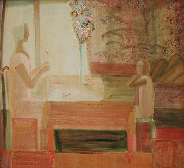 Картина представляет собой двухфигурную композицию в бытовом жанре. В центре изображён квадратный стол, за которым слева сидит женщина с белыми волосами, одетая в платье с короткими рукавами. Она держит бумажный цветок, а перед ней на столе расположены ножницы, обрезки бумаги и высокий голубой сосуд с разноцветными бумажными цветами. Рядом лежат полоски цветной бумаги. Справа за столом на табурете изображена девочка-подросток со светлыми волосами и голубыми глазами, корпус которой повернут влево, а лицо — в три четверти влево. Она опирается локтями на стол, а кисти рук находятся возле щеки. На стене за девочкой размещён ковёр. В работе преобладают оттенки охры, коричневого, белого и зеленоватого, что формирует характерную цветовую гамму произведения.