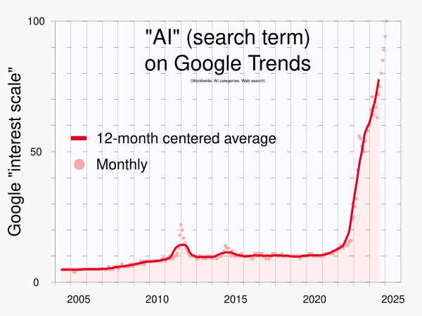 В 2012 году исследовательская группа Торонтоского университета использовала искусственные нейронные сети и методы глубинного обучения, чтобы впервые снизить уровень ошибки ниже 25 % на соревновании ImageNet по распознаванию объектов в компьютерном зрении. Это событие стало катализатором бума ИИ в последующие годы, когда многие выпускники ImageNet стали лидерами индустрии[7][8] В марте 2016 года программа AlphaGo одержала победу над Ли Седолем в матче из пяти игр, впервые победив 9-данного профессионального игрока в го без форы. Этот матч привёл к росту интереса общественности к ИИ. Гонка генеративного ИИ началась в 2016—2017 годах с появлением OpenAI и достижениями в области графических процессоров (GPU), использования масштабных обучающих данных, генеративных состязательных сетей (GAN), моделей диффузии и архитектур трансформеров[9].