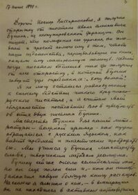 Я получил открытку от писателя Ивана Алексеевича Бунина, из неоккупированной Франции. Он пишет, что положение его ужасно, он голодает и просит помочь ему в том, чтобы наши издательства, переиздававшие его книги, оказали ему материальную помощь.