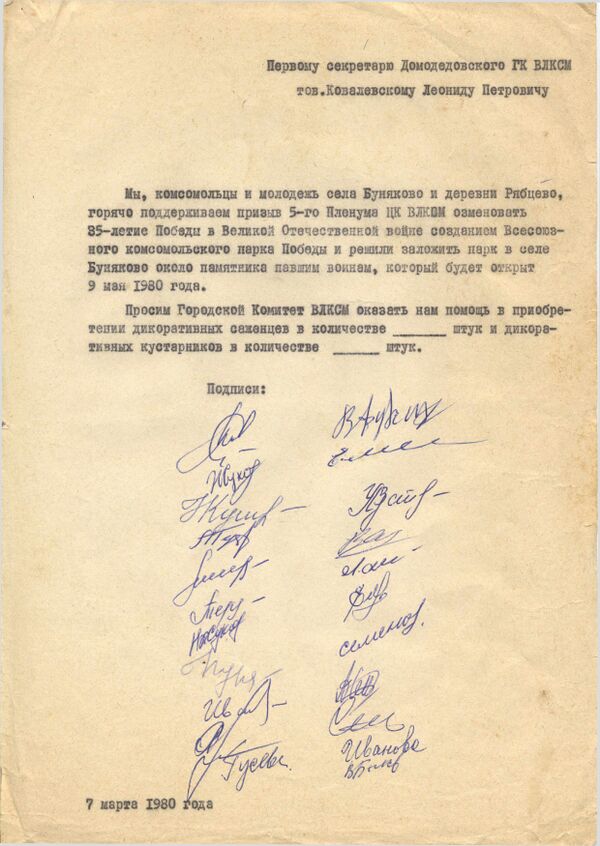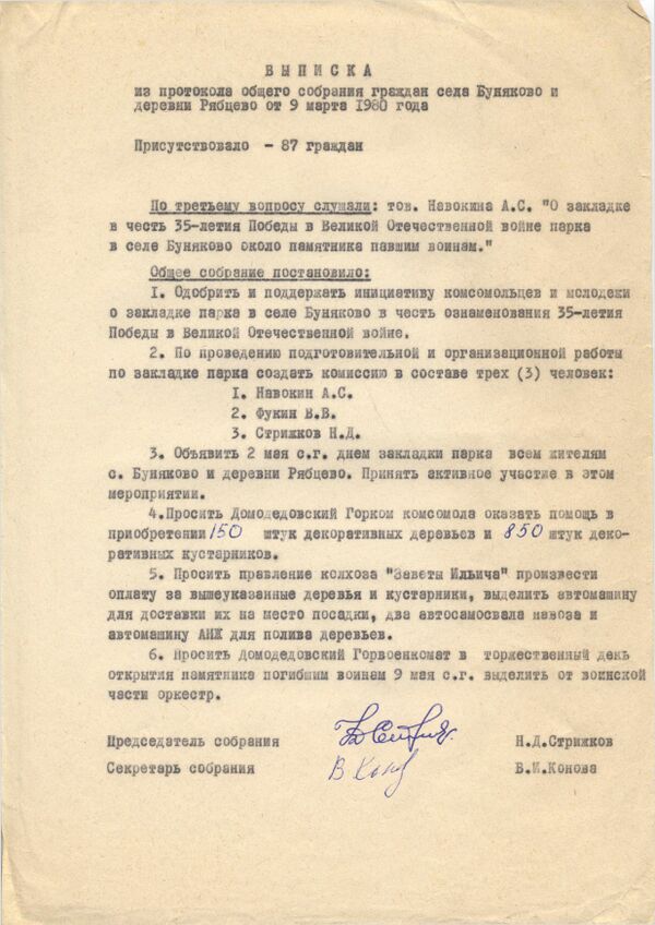 7 марта 1980 года комсомольцы и молодежь села Буняково и деревни Рябцево горячо поддерживая призыв 5-го Пленума ЦК ВЛКОМ ознаменовать 35-летия Победы в Великой Отечественной войне созданием Всесоюзного комсомольского парка Победы и решили заложить парк в деревне (селе) Буняково около памятника павшим воинам.
