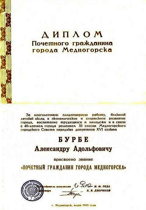 В 1966 году А. А. Бурба был избран делегатом от Медногорской городской партийной организации на XXIII съезд КПСС и участвовал в работе съезда с правом решающего голоса[110].