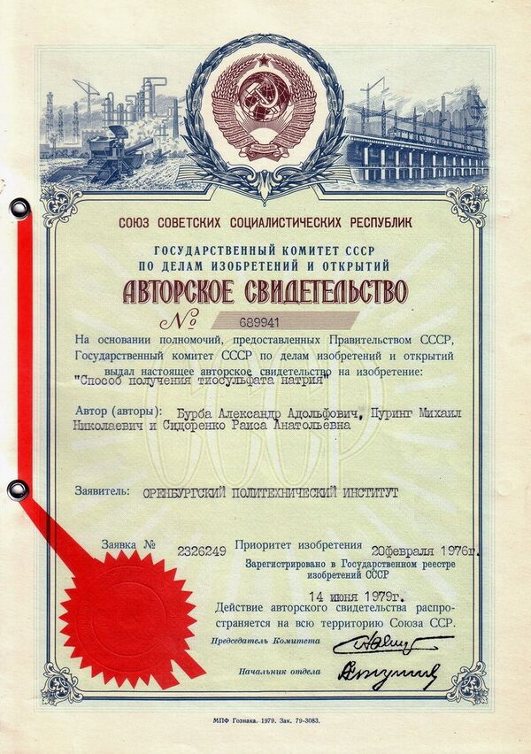 - А. с. № 161491 «Способ извлечения таллия из сложных производственных растворов осаждением». Заявлено 11.01.1963. Опубл. 19.03.1964 в Бюлл. изобретений № 7 (соавт.: М. М. Шнякина, Ф. Д. Аптекарь, В. И. Садыков, А. К. Шарова, И. А. Ульянова)[116].