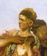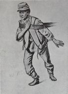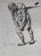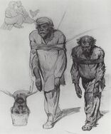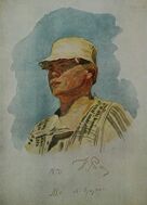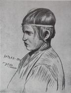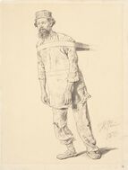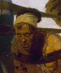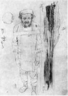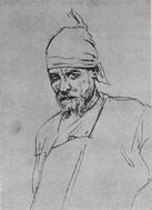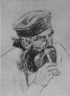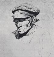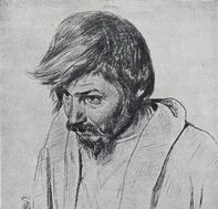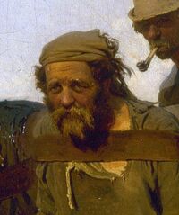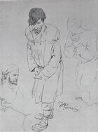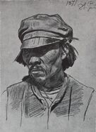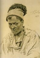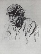 Кроме того, известны графические этюды «Алёшка-поп»[179][186], «Лёвка-дурачок»[179], «„Как за хлеб, так за брань“»[187] (этюд старого бурлака с трубкой)[42] и «Бурлак (солдат)» (другая версия)[133] — в частности, они были воспроизведены в воспоминаниях Репина[42][188]. Образы Алёшки-попа и Лёвки-дурачка не были включены в окончательную версию полотна[189], в то время как образ бурлака с эскиза «„Как за хлеб, так за брань“», вероятно, был использован при написании «грека»[120]. По данным 1960 года, в коллекции Е. Миллеровой в Праге находился этюд «Канин (в фас)»[133].