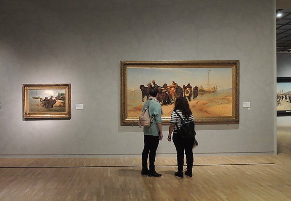 3 мая 1873 года Репин, наконец, отправился в зарубежную пенсионерскую поездку[75]. По пути в Италию он остановился на десять дней в Вене и посетил Всемирную выставку, где экспонировались «Бурлаки». Из представленных там произведений других авторов Репин выделил картины польского художника Яна Матейко, а также портрет генерала Прима, написанный французским живописцем Анри Реньо[76][77]. В письме к Владимиру Стасову от 4 июня 1873 года Репин жаловался на то, что присланные из Санкт-Петербурга в Вену экспонаты «валялись недели три под каким-то забором, под дождём», в результате чего на его картине появились «полосы потёков грязи сверху вниз» — по словам художника, «едва отмыл я их, и то не совсем, даже не отмывались»[78].