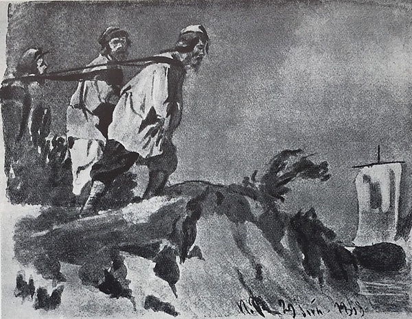 По впечатлениям, полученным от поездки по Неве, Репиным были созданы акварельные эскизы. Один из них был воспроизведён в воспоминаниях художника — на нём силуэты бурлаков изображены на фоне неба над обрывом, а ниже по реке плывёт небольшое парусное судно[31]. Образное решение эскиза «смутно и неопределённо» — художник пытается как можно скорее и непосредственнее передать те чувства, которые он испытал при виде тяжёлого и мучительного труда тянущих лямку людей[32]. Другой эскиз включал не только бурлаков, но и контрастировавших с ними дачников[33][34][35], однако художник-пейзажист Фёдор Васильев раскритиковал такую композицию, заявив Репину: «Слишком тенденциозно. Зачем эти навязчивые сравнения — нарядные барышни и бурлаки. Картина должна быть шире, проще. Бурлаки, так бурлаки! И чем проще будет картина, тем художественней»[36].
