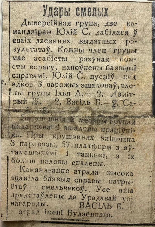 С июня 1942 года по март 1944 года воевал в партизанском отряде имени С. М. Будённого на территории Гомельской области Белоруссии. Был командиром подрывной группы (разведчик, диверсант-подрывник)[3]. Находясь в составе диверсионной группы из шести человек, спустил под откос 2 эшелона противника, 1 контрольный паровоз (разбито 3 паровоза, 58 вагонов с живой силой противника, техникой, боеприпасами, горючим), взорвал 7 автомашин, 3 повозки с боеприпасами, радиоустановкой, подорвал железнодорожный мост на направлении Гомель — Калинковичи и 56 рельс. Участвовал в боях с немецкими карательными экспедициями под Узножем Речицского района Гомельской области. При возвращении с боевого задания подорвался на вражеской мине, был ранен и контужен.