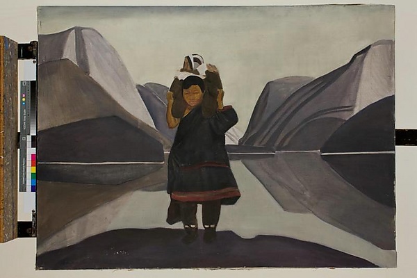 В центре композиции изображена женщина, стоящая на берегу и поддерживающая руками ребёнка, сидящего у неё на плечах. На заднем плане располагается водная поверхность, окружённая нагромождениями серых скал.