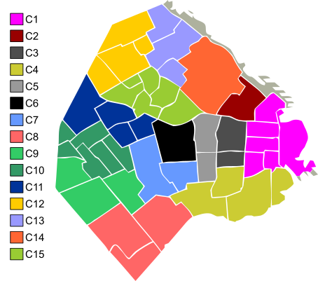 - C1: Ретиро, Сан-Николас, Пуэрто-Мадеро, Сан-Тельмо, Монсеррат, Конститусьон