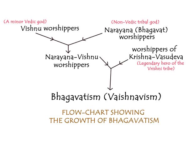 Бхагаватизм возник как компромисс между развитой идеологией брахманизма и местными религиозными культами. Основные черты бхагаватизма сложились в период между VIII и II веками до н. э. на территории между Ямуной и Гангой. Традиция родилась в результате взаимодействия ведической религии ариев с местными религиозными воззрениями. К тому времени язык древних ведической текстов стал малопонятным большинству населения, а само общество ушло вперед в понимании, что оно всё меньше зависит от силы природы и поклонения природным духам. Основные черты бхагаватизма сформировались к IV веку до н. э. Эпицентр культа, по всей видимости, находился в племени пастухов Ядавов, которые поклонялись герою Кришне. Его образ стал ассоциироваться с другими объектами поклонения, такими как Бала-Кришна (божественный ребёнок) и Гопала (мальчик-пастушок). Развитие ведизма в направлении вайшнавизма происходило на старом фундаменте ведических верований. Главным в нём было последовательное приведение множественности природных феноменов и разнообразия видимого мира к единой божественной сущности, а также упорядочивание космогонии и теологии[6].