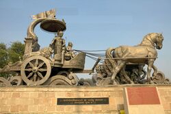 Скульптурная композиция: беседа между Арджуной (лучником, символизирующим душу) и Кришной (колесничим, воплощающий Бога) из Бхагавадгиты о войне и дхарме, храмовый комплекс на Курукшетре, Индия. - среди четырёх видов почитателей Бога наиболее достойны похвалы возвышенные души, то есть те, кто стремятся постичь Высшую реальность, обладают духовным знанием и отдаёт себя преданному служению Богу (VII. 16-19);