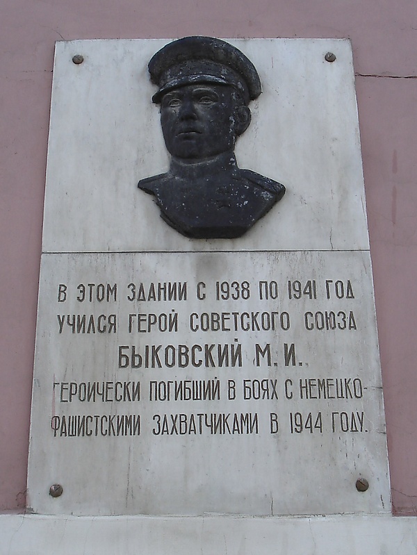 - Мемориальная доска в память о Быковском установлена Российским военно-историческим обществом на здании Маньковской средней школы, где он учился, его имя присвоено этой школе.