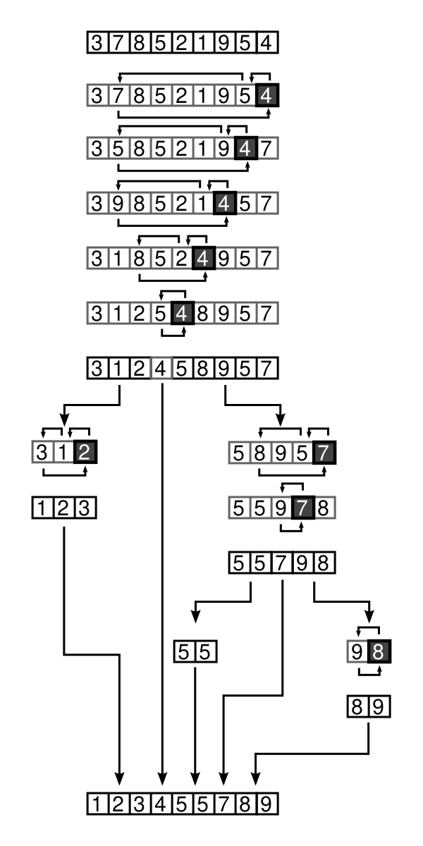 - Рекурсивно применить первые два шага к двум подмассивам слева и справа от опорного элемента. Рекурсия не применяется к массиву, в котором только один элемент или отсутствуют элементы.