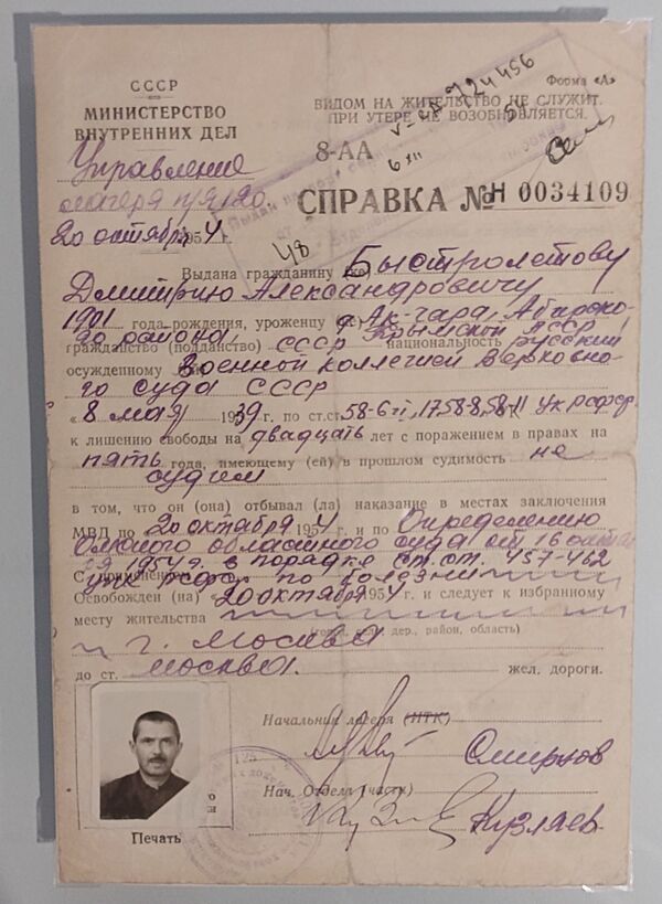 17 сентября 1938 года Быстролётов был арестован[13]; 8 мая 1939 года Военная коллегия Верховного Суда Союза ССР приговорила его по ст. 58 ч. 6, 7, 8 УК РСФСР к исправительно-трудовым лагерям сроком на двадцать лет, с поражением в политических правах на пять лет и с конфискацией личного имущества.
