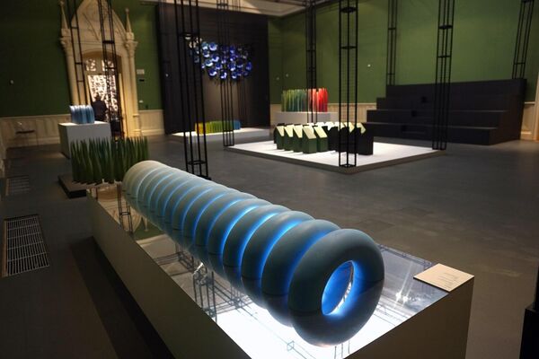 Выставка «Быть в материале» посвящена керамике и её связи с промышленным дизайном. В последнее столетие искусство всё чаще становится источником идей для дизайнеров, а дизайн помогает художникам актуализировать творческие порывы. Это взаимопроникновение и стремились показать устроители экспозиции.