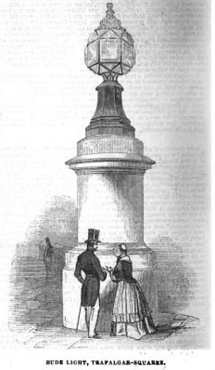 Четыре Бьюдские лампы в восьмигранных светильниках установлены на Трафальгарской площади в 1845 году, в какой-то момент переделаны в электрические и используются до сих пор. Два фонаря против Национальной галереи установлены на высоких литых бронзовых колоннах, а два на юго-восточном и юго-западном углах — на гранитных постаментах. Фонари по проекту Чарльза Бэрри изготовлены Messrs. Stevens and Son в Саутварке[7].