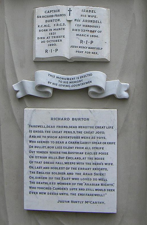 Супруги похоронены в приделе католической церкви Святой Марии-Магдалины на юго-западе Лондона, в могиле в форме бедуинской палатки — её проект разработала сама Изабель[25]. Гробы сэра Ричарда и леди Бёртон можно увидеть через окно в задней части палатки. В часовне установлен мемориальный витраж, изображающий Бёртона в образе средневекового рыцаря[26]. Личные вещи Бертона и коллекция картин и фотографий, относящихся к нему, находятся в коллекции в Orleans House Gallery[27].