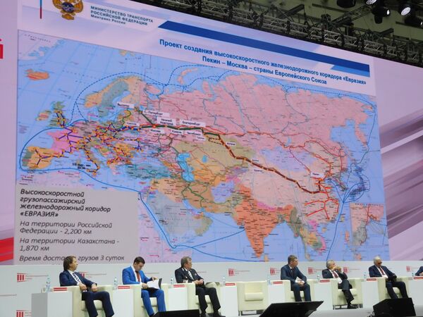 На презентации проекта ВСМ на международном инвестиционном форуме «Сочи-2014» 22 сентября признана его высокая стратегическая значимость и отмечено единственное препятствие к его реализации — высокая стоимость, из-за чего бюджетных решений пока не найдено. Интерес к проекту проявлен со стороны Китайского банка развития, имея в виду перспективное продление высокоскоростной магистрали до Пекина (около 8000 км), с расчётным временем в пути из Москвы до 30 часов и стоимостью российского участка в 2,5—2,8 трлн руб[32][77]. Стоимость сооружения всей трассы Москва — Пекин через Казань, Екатеринбург, Астану, Иркутск, Хабаровск, Улан-Батор[78] оценивается в 245 млрд долларов, исходя из расчётов стоимости строительства по китайской технологии 33 млн долларов за 1 км пути[79] (сравнительно: 50 млн долларов за 1 км пути по европейской технологии)[80][81].