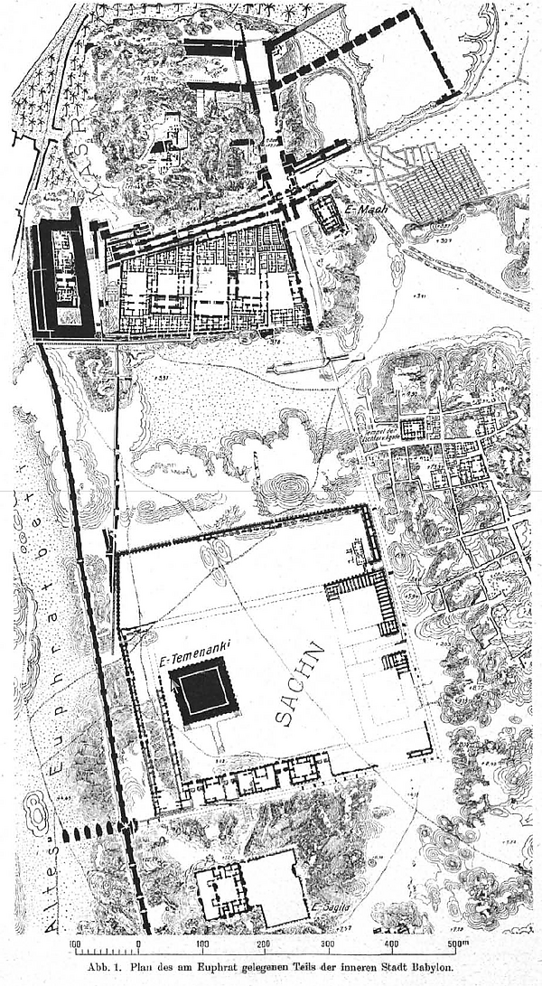 В Вавилоне имелось множество храмов, посвящённых различным божествам — Иштар, Нанне, Ададу, Нинурте, однако наибольшим почтением пользовался покровитель города и глава пантеона царства — Бэл-Мардук. В его честь, в самом центре столицы был возведён масштабный комплекс Эсагила с семиступенчатым зиккуратом Этеменанки — Вавилонской башней высотой 91 м; Р. Кольдевею удалось раскопать лишь часть Эсагилы. Севернее, на месте холма Каср, располагались фортификационные сооружения, примыкавшие к Южному дворцу Навуходоносора II; там же открыты сводчатые конструкции, как тогда предполагалось — остатки знаменитых Висячих садов. Массивные укрепления прикрывали парадный вход в Вавилон, путь к которому проходил от Северного дворца (телль Бабиль) по Дороге Процессий через ворота Иштар. Летний или Северный дворец был возведён в виде крепости, охранявший предместья у начала Дороги Процессий. Богато украшенные ворота Иштар были полностью раскопаны, в основной своей части перевезены в Берлин, установлены в Пергамском музее и реконструированы. С началом Первой мировой войны раскопки велись менее интенсивно; в 1917 году приближение войск Антанты вынудило немецкую экспедицию прекратить работы.[93]