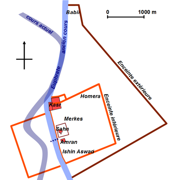 Среди руин Вавилона наиболее примечательные телли и области имеют собственные названия; все они расположены на восточном берегу Евфрата. Традиционно выделяются следующие участки[15]: