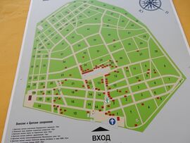 В комплекс благоустройства некрополя входило также строительство храма, гостиницы и дорожки, устройство въездных ворот и обновление вала вокруг кладбища[42]. В 1822-м при входе поставили комплекс построек в едином стиле с архитектурой храма, справа от ворот завершили строительство одноэтажной каменной гостиницы, а слева — каменного дом для трёх сторожей и двух казаков-охранников[43].