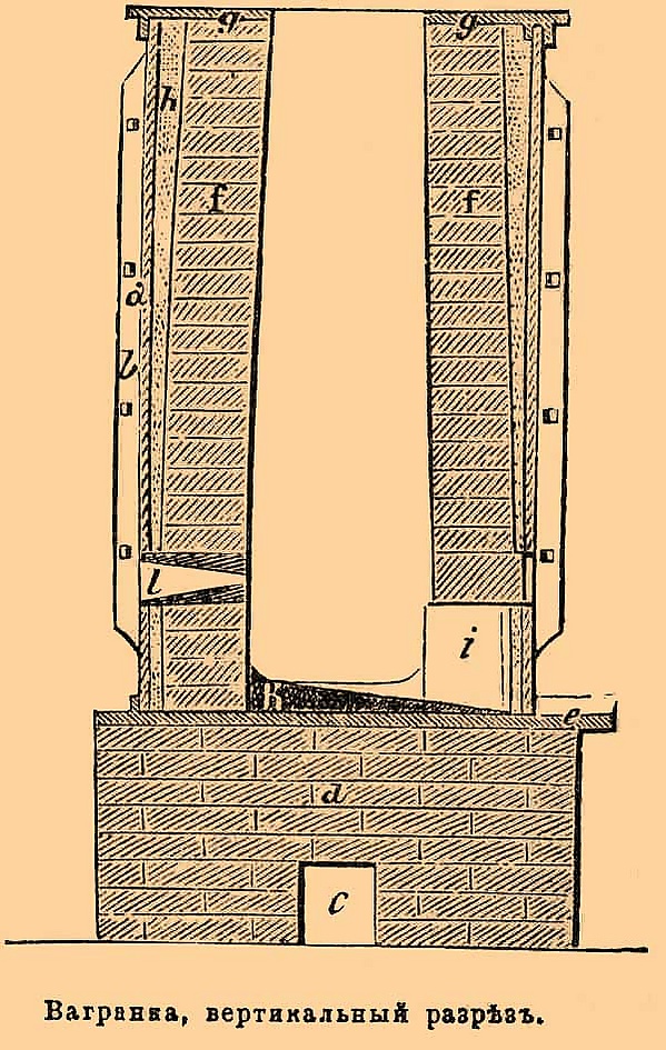 Вагранка же работала периодически, её пускали в ход сообразно количеству форм для заливки, приготовленных для заливки. Из предлагаемых усовершенствований особого внимания заслуживает предложение Герберца, который предложил вдувание воздуха снизу заменяет высасыванием продуктов горения на колошник; воздух, необходимый для горения угля, входит в щель, оставляемую между горном и шахтой, а газы наверху увлекаются струёй паров. По опытам Герберца, применение к его вагранке воздуха, нагретого до 600°, даёт возможность плавить бессемеровскую сталь; ежели опыты эти подтвердятся, то такая вагранка получит огромное значение, вследствие все более и более усиливающегося запроса на стальную фасонную отливку, стремящуюся заменить собой чугунное литьё.