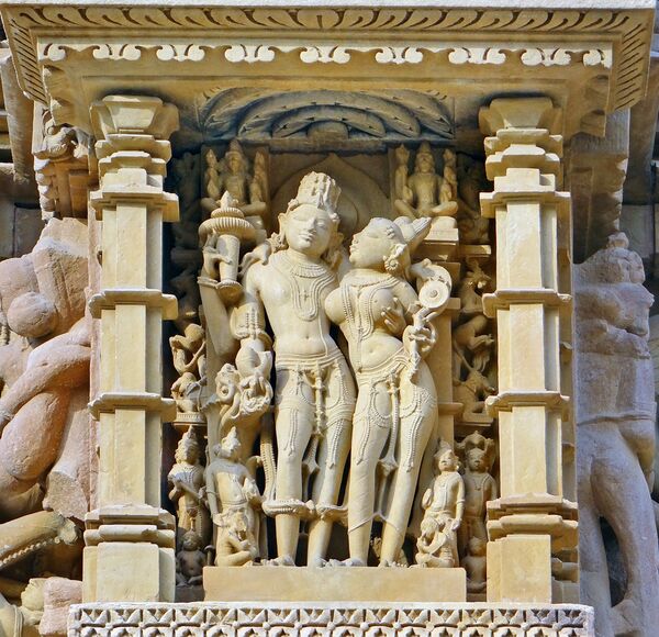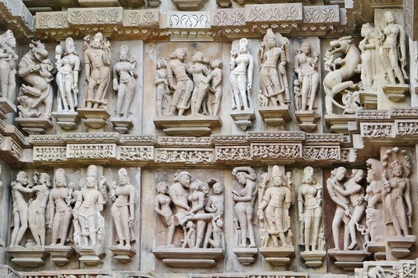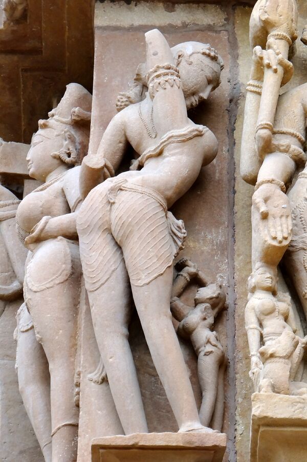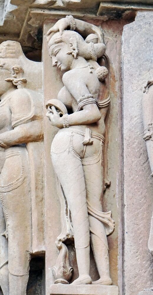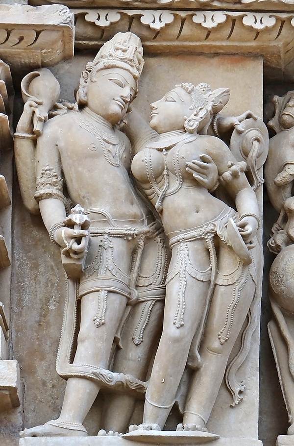 Сура-сундари (небесные красавицы), символы красоты, изящества и чувственности, в храмовом комплексе Кхаджурахо: юные создания ухаживают за собой, одеваются и обнимаются с возлюбленным