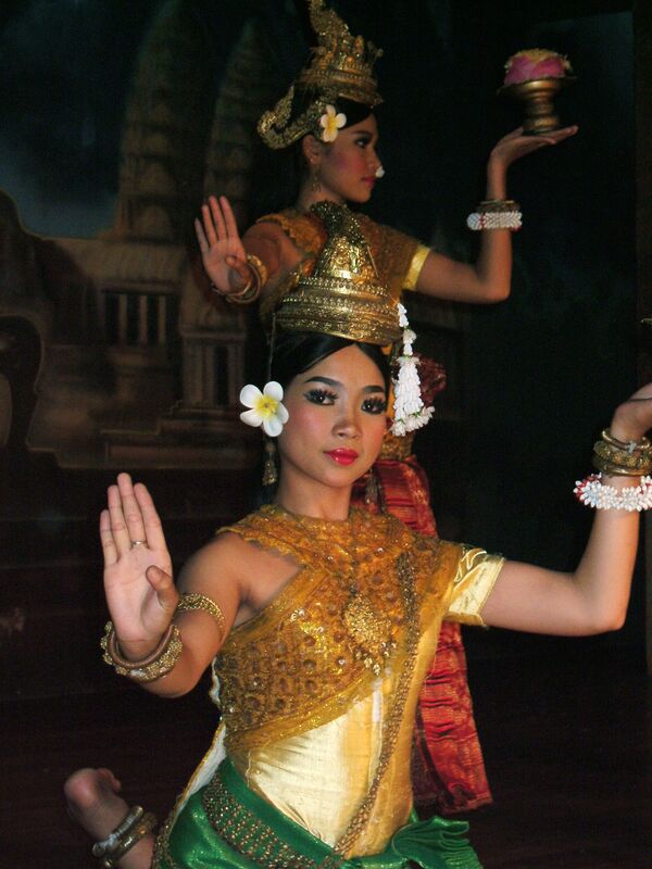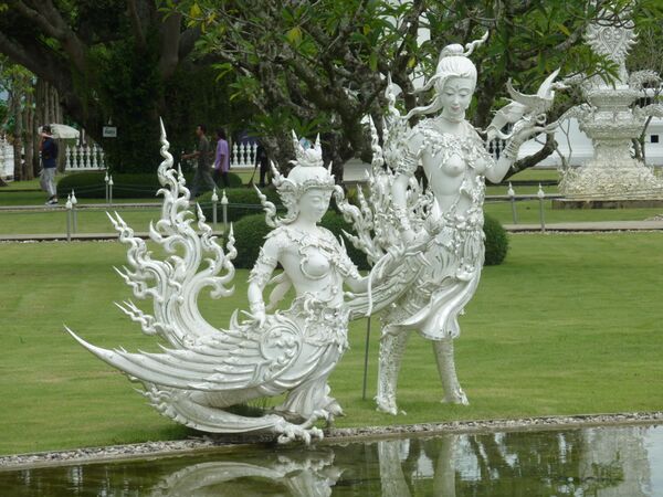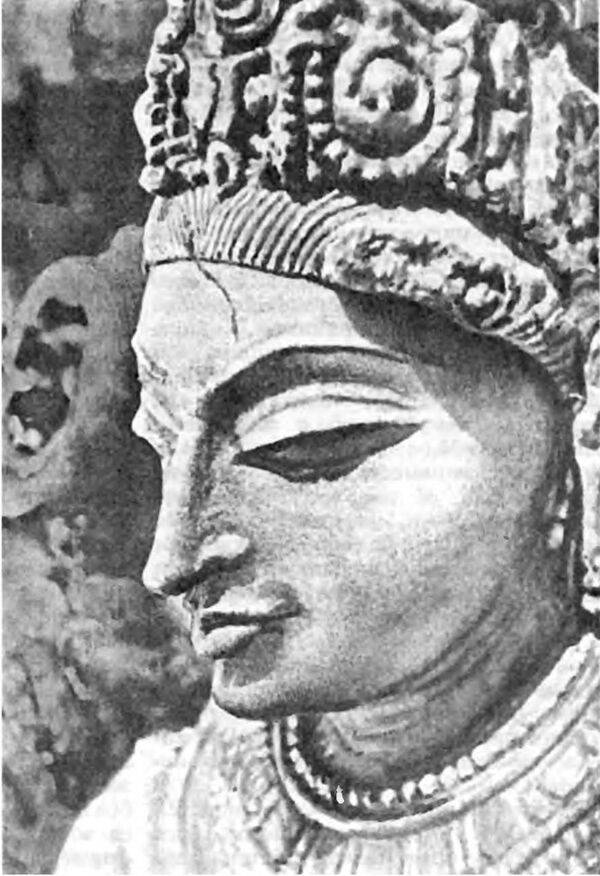 У юных созданий нежные, мягкие руки в звенящих золотых браслетах, подобные молодым росткам. На их стройных животах заметы три складки и ниже — линия тонких волос. Высокие груди девушек напоминают переполненные кувшины. Жемчужные ожерелья на них плавно покачиваются на каждом шагу. Кажется, что сияющие украшения отблескивают солнечными зайчиками мокрой груди. В правой руке они игриво держат цветы водной лилии, а левая покоится на плечах мужественных спутников. Серьги отбрасывают блики на щеках, их лица озаряют нежные улыбки, а сами они искоса бросают взгляды на своих юношей.