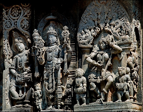 Скульптурные украшения на стенах Храма Лакшмана в Кхаджурахо (Индия, 930—954 годы): Вишну в окружении небесных красавиц и влюблённых пар.Сады Вайкунтхи (тексты 37-48). Когда девушки спускаются из небесных колесниц и выдвигаются вперед, звеня цепочками и браслетами на лодыжках, молодые люди оглядываются на них, будто взывают к их красоте. Юные создания идут медленно, словно утомленные весом своих пышных грудей. В объятьях супругов они обретают вдохновение и входят в дивные сады Вайкунтхи.
