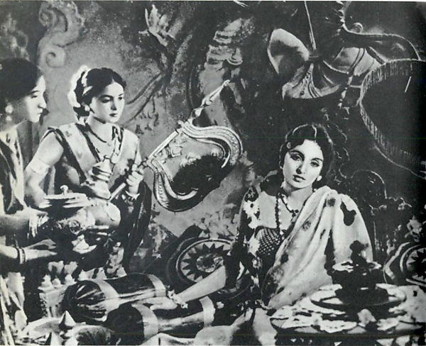 Одни девушки подобны красным рубинам, другие светлые как ожерелья чистого жемчуга, третьи — иссини-тёмные как драгоценные сапфиры. Их красоту подчёркивают мерцающие украшения. Вместе они напоминают темные дождевые облака. Их одежды легки как воздух, а голос сладок как пение лесных попугайчиков.