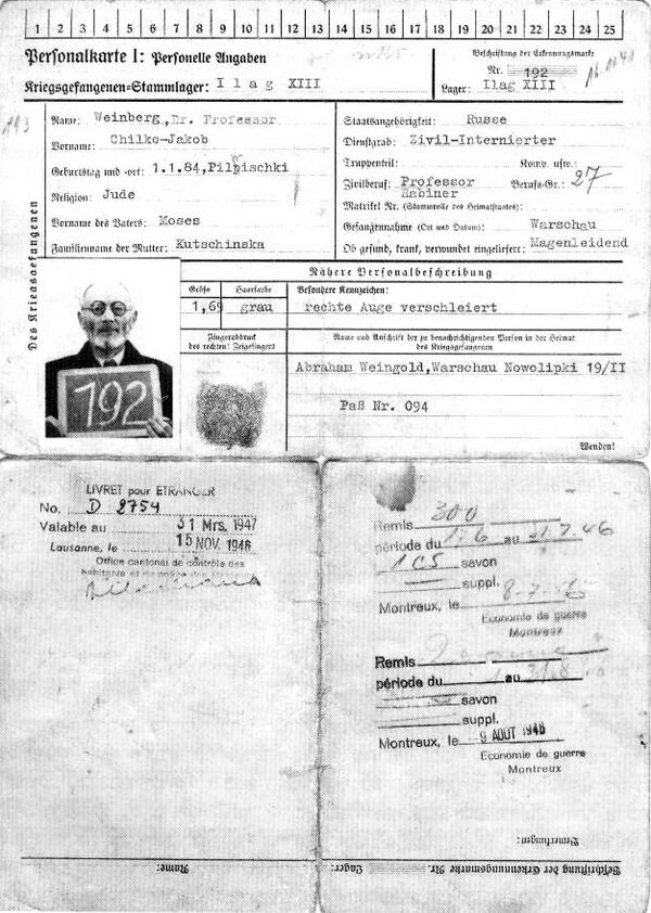 Первое время определённую помощь давал советский вид на жительство, который Вайнберг смог получить как бывший подданный России, ранее проживавший на территории, которая теперь принадлежала СССР. После нападения Германии на Советский Союз советские документы помогать перестали. Вайнберг был брошен в тюрьму «Павяк», где провёл две недели. Затем он был переведён в тюрьму для советских граждан, где условия были несколько лучше. Примерно в это время главный раввин Уругвая предпринял неудачную попытку вызволить Вайнберга[55]. Следующим пунктом был лагерь для перемещённых лиц, куда его перевезли в октябре 1941 года вместе с 40 литовцами. Позже его перевели в крепость Вюльцбург[56] близ Вайсенбурга в Баварии, предназначенную для советских военнопленных и контролируемую армейскими властями, а не СС.