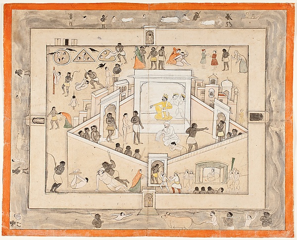 Там он увидел кровавую реку Вайтарани, в которой, испуская жалобные вопли, плавали грешники, расплачивающиеся муками за совершённые при жизни злые деяния. На берегах той реки другие грешники, погружённые в раскалённый песок, претерпевали ужасные страдания. Там росли деревья с шипами и мечами вместо листьев, и те шипы и мечи кололи и резали тела грешников. Жестокие слуги Ямы мучили несчастных огнём и острыми копьями, их грызли собаки и поедали черви, и Равана увидел там сотни и тысячи обречённых на страдания, мучимых голодом и жаждой, бледных, исхудавших, покрытых грязью и кровью и громко вопящих от боли. Но там же, в обители Ямы, Равана увидел души добродетельных, наслаждающиеся в красивых чертогах сладкозвучной музыкой и пением, ласками прекрасных дев и обилием риса, молока и всяческих яств[2].