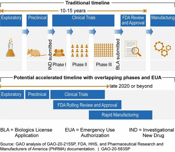 Высокая распространённость заболевания, из-за которой различия между группами вакцины и плацебо в испытаниях начинают достаточно быстро проявляться, новые технологии, предыдущий опыт создания вакцин против родственных вирусов, быстрое реагирование регулирующих органов на данные об эффективности вакцин и международное сотрудничество позволяют производить вакцины намного быстрее[22]. В этом случае процесс производства возможен уже на стадии клинических испытаний.