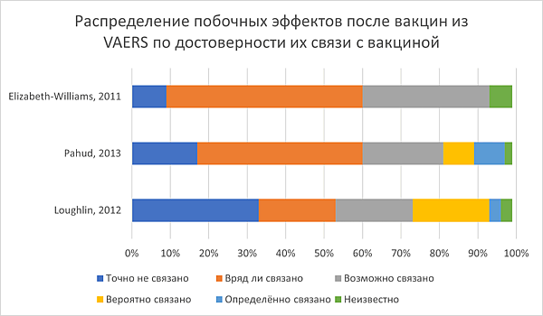 Безопасность вакцин изучается во время крупных клинических испытаний на десятках тысяч человек, затем побочные эффекты отслеживаются системами мониторинга безопасности[180]. Антипрививочники часто используют данные таких систем (например, американской VAERS) для завышения количества побочных эффектов от вакцинации. Необходимо понимать, что, о побочных эффектах в VAERS может заявлять практически кто угодно — точнее, поставщики медицинских услуг, производители вакцин и общественность. На сайте VAERS прямо сказано, что отчёты о побочных эффектах в VAERS не позволяют сделать вывод о существовании причинно-следственной связи между вакцинацией и осложнением[181]. Многие внесённые в VAERS случаи смерти после вакцинации никак не могут быть связаны с прививкой[182][183]. Анализ всех смертей, зарегистрированных в VAERS c 1997 по 2013 год, показал сильное сходство основных причин этих смертей с основными причинами смертей среди населения в целом, и на миллион доз вакцины приходилось всего одно сообщение о смерти. В целом, в анализе не было найдено причинно-следственной связи между вакцинацией и смертями[184]. По данным трёх анализов побочных эффектов из VAERS, менее половины из них могут быть с какой-то степенью достоверности связаны с вакцинацией (см. изображение справа). В случае вакцин от коронавируса, похоже, что количество смертей после вакцинации, зарегистрированное в VAERS, можно ожидать и случайным образом[185]. Все сообщения о смерти были проанализированы CDC и FDA, и причинно-следственная связь не была обнаружена[186].