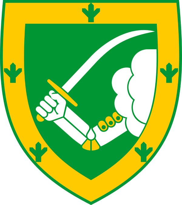 Герб: на зелёном щите из серебряного облака выступает серебряная рука в брони с золотыми деталями, которая держит серебряную саблю с золотой ручкой. На золотой кайме 5 зелёных хвойных растений.